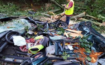 Drzewo zmiażdżyło samochód, a drugi w nie wjechał