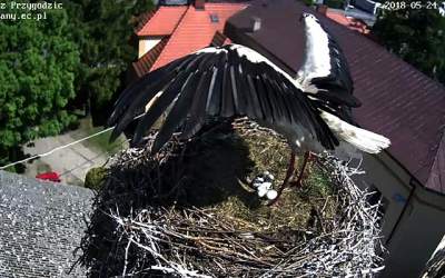 Boćki z Przygodzic mają potomstwo. Można obserwować wykluwanie z kolejnych jaj