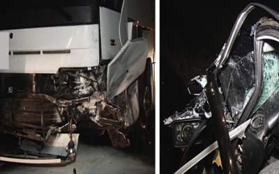 Czołowe zderzenie autokaru z osobówką