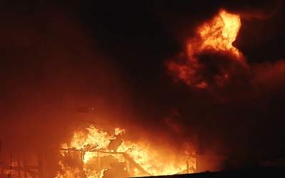 Policjanci wyprowadzili kobietę z płonącego budynku