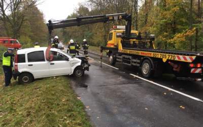 Wjechali w maszynę leśną. Auto na dachu