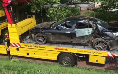 Maserati rozbite na latarni. W środku policjant