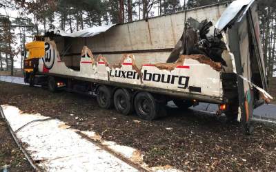 Roztrzaskana naczepa samochodu ciężarowego