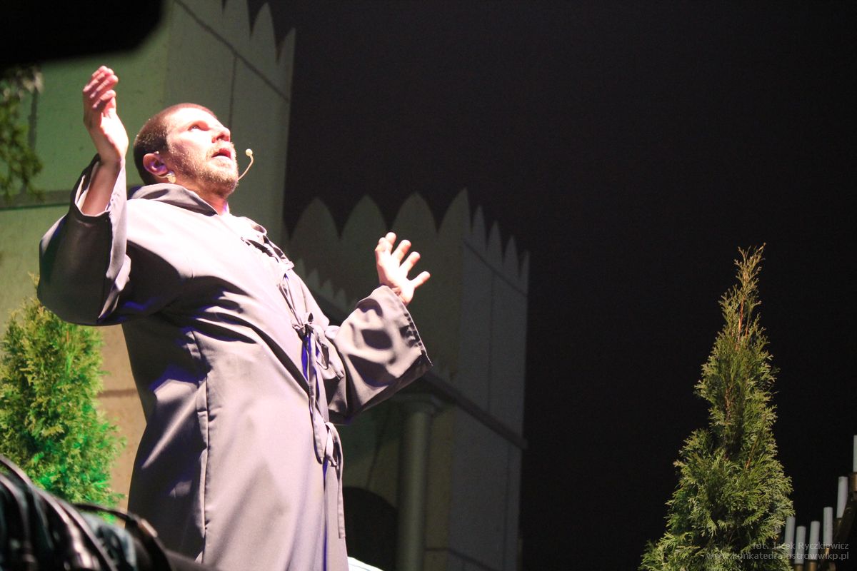 Misterium Męki Pańskiej rozpoczęło się od przybycia Jezusa z gromadą dzieci. Sceny z Wieczernika, Ogrodu Oliwnego, sądu Kajfasza oraz sądu Piłata przeplatane były obrazem współczesnej rodziny. Zapracowany ojciec, zabiegana matka, syn słuchający muzyki, córka z telefonem w ręce i wspólna wieczerza, która przeplatana jest kłótniami. W parku odegrana została realistyczna scena biczowania, w której udział wziął współczesny ojciec. Stamtąd Jezus w obstawie rzymskich legionistów, którzy byli także na koniach, przeszedł w drodze krzyżowej na golgotę, która znajdowała się przy Konkatedrze. Chrystus ukrzyżowany został wraz ze złym łotrem – ojcem i dobrym łotrem – matką. Ciało Zbawiciela przeniesione zostało do grobu w Konkatedrze, którym był konfesjonał. Zgromadzeni w kościele mogli wysłuchać spowiedzi dwojga młodych ludzi – córki i syna ukrzyżowanych rodziców. W konfesjonale ukrzyżowany Chrystus zamienił się w Najświętszy Sakrament.