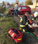 Na miejsce wysłano straż pożarną, pogotowie, policję oraz śmigłowiec LPR. Strażacy musieli wycinać kobietę z wraku auta. Okazało się, że ma złamane podudzie z przemieszczeniem. W drugim aucie ucierpiało dziecko, które doznało urazu głowy. Było przytomne. Poszkodowaną kobietę przetransportowano do ostrowskiego szpitala.