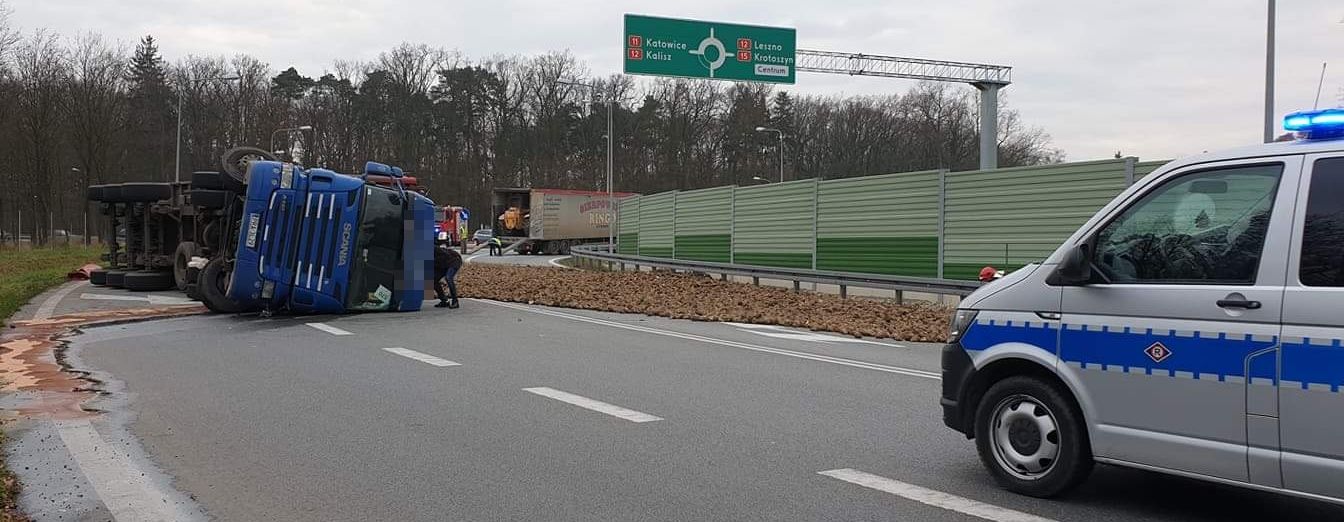 – Mieszkaniec powiatu rawickiego wjeżdżając na rondo w kierunku S11, kierując samochodem ciężarowym marki Scania wraz z naczepą, nie dostosował prędkości do warunków na drodze i doprowadził do przewrócenia się całego zestawu. W wyniku tego z naczepy na jezdnię wysypały się buraki cukrowe – informuje asp. Agnieszka Zaworska, rzecznik prasowy KPP w Jarocinie.