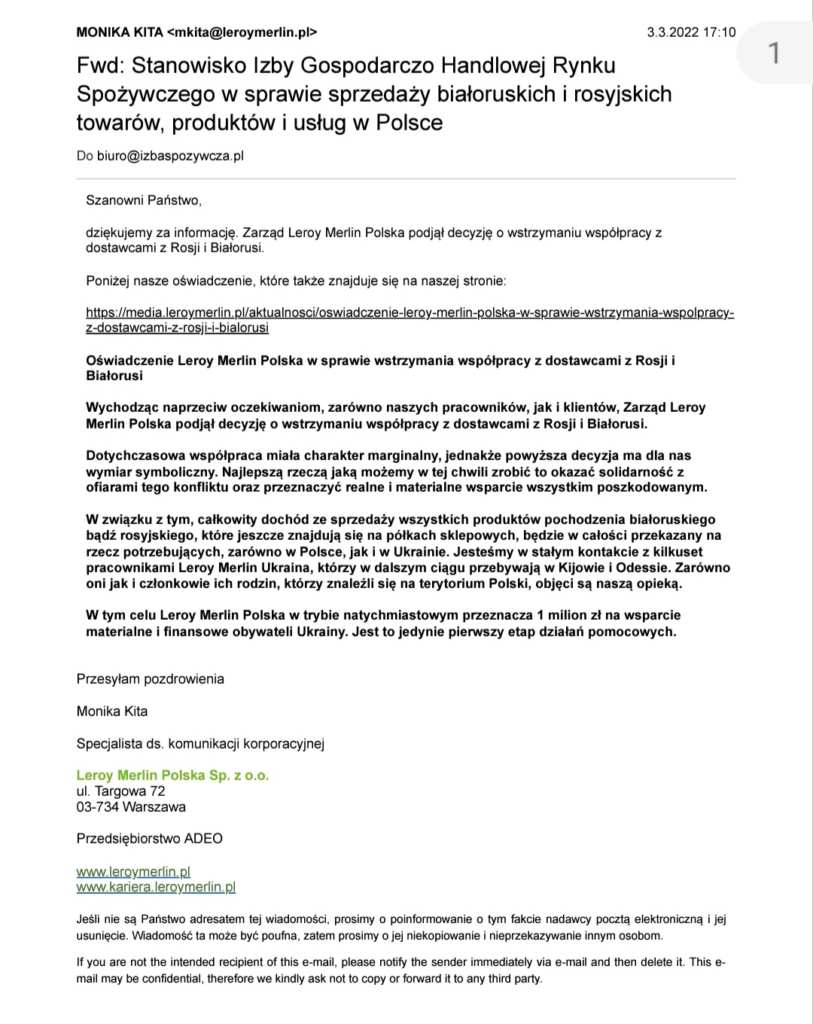 Testem lojalności i szczerych intencji wobec konsumentów i opinii publicznej będzie wycofanie Państwa produktów z rynku białoruskiego i rosyjskiego oraz zamknięcie sklepów w tych państwach. W naszej ocenie świadome wykorzystywanie sytuacji ograniczonej konkurencji, ograniczonej podaży, zwiększonego popytu przy jednoczesnym zastosowaniu światowych sankcji wobec Białorusi i Rosji ma charakter nieetyczny i takie działania powinny być piętnowane przez konsumentów oraz gospodarki państw solidaryzujących się z narodem ukraińskim.”
