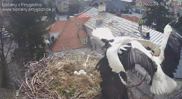 10:37 – bocian ogląda jaja. Zdecydowanie trzy w dołku.