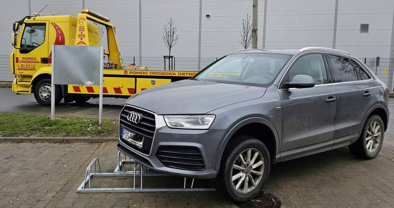 Dzisiejsza kierująca z audi q3 korzysta niemal codziennie z tego parkingu, a i tak wpadła w tarapaty. Nie zwróciła uwagi na stojak i zawiesiła się autem.