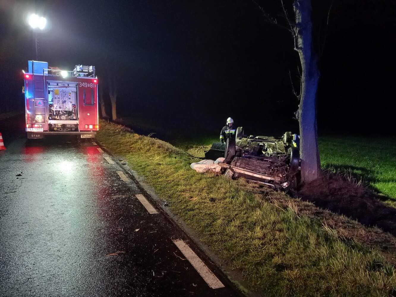 Służby ratunkowe zostały powiadomiono po godzinie 3 w nocy, że na trasie z Godziesz Wielkich na Ołobok dachował samochód osobowy. Na miejscu okazało się, że audi leży na dachu, tuż obok drzewa. Podróżował nim 19-latek, który wydmuchał pół promila alkoholu. Pasażerką była 17-latka w 9. miesiącu ciąży.