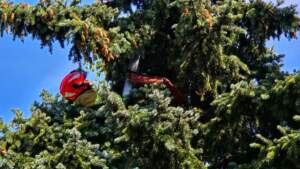 Widok kota leżącego na szczycie świerku zaniepokoił okolicznego mieszkańca. Na miejsce wysłano strażaków.