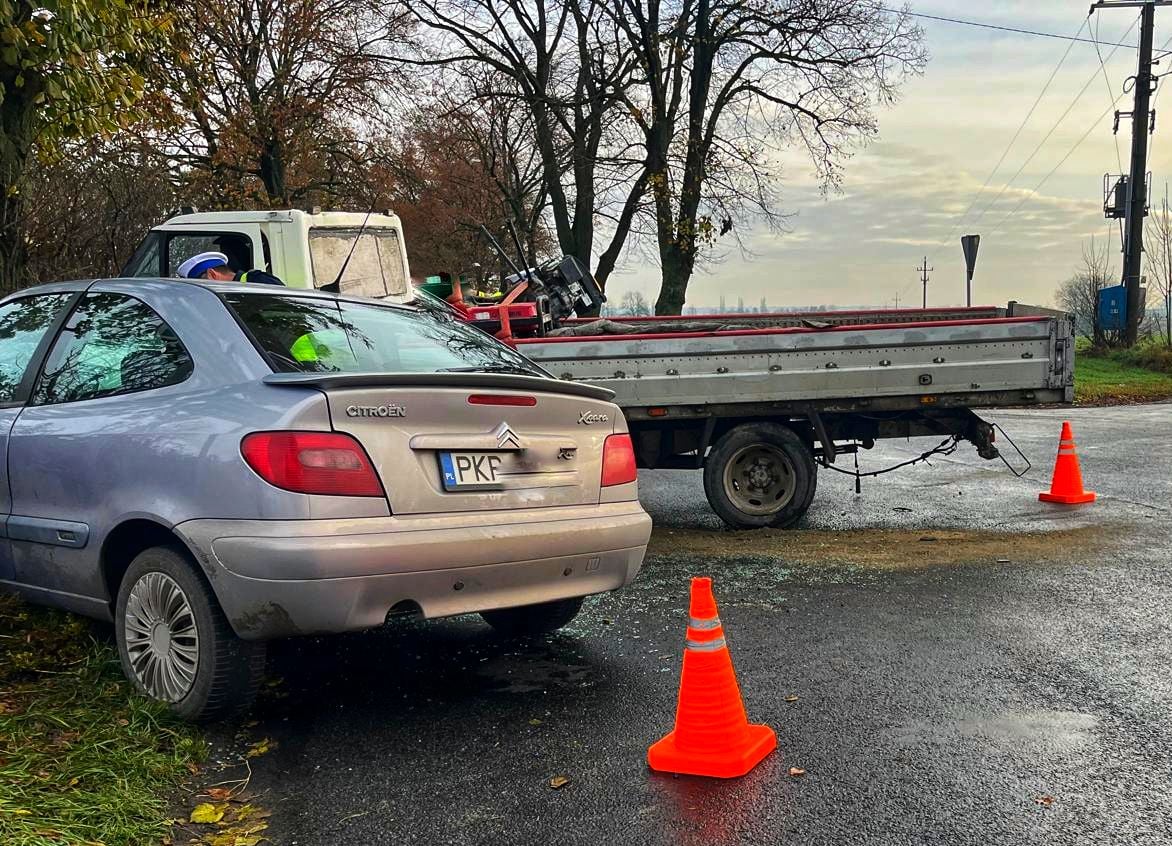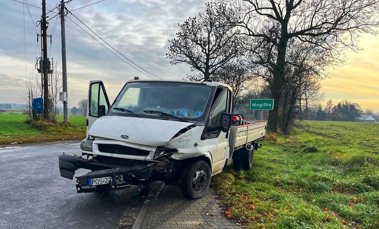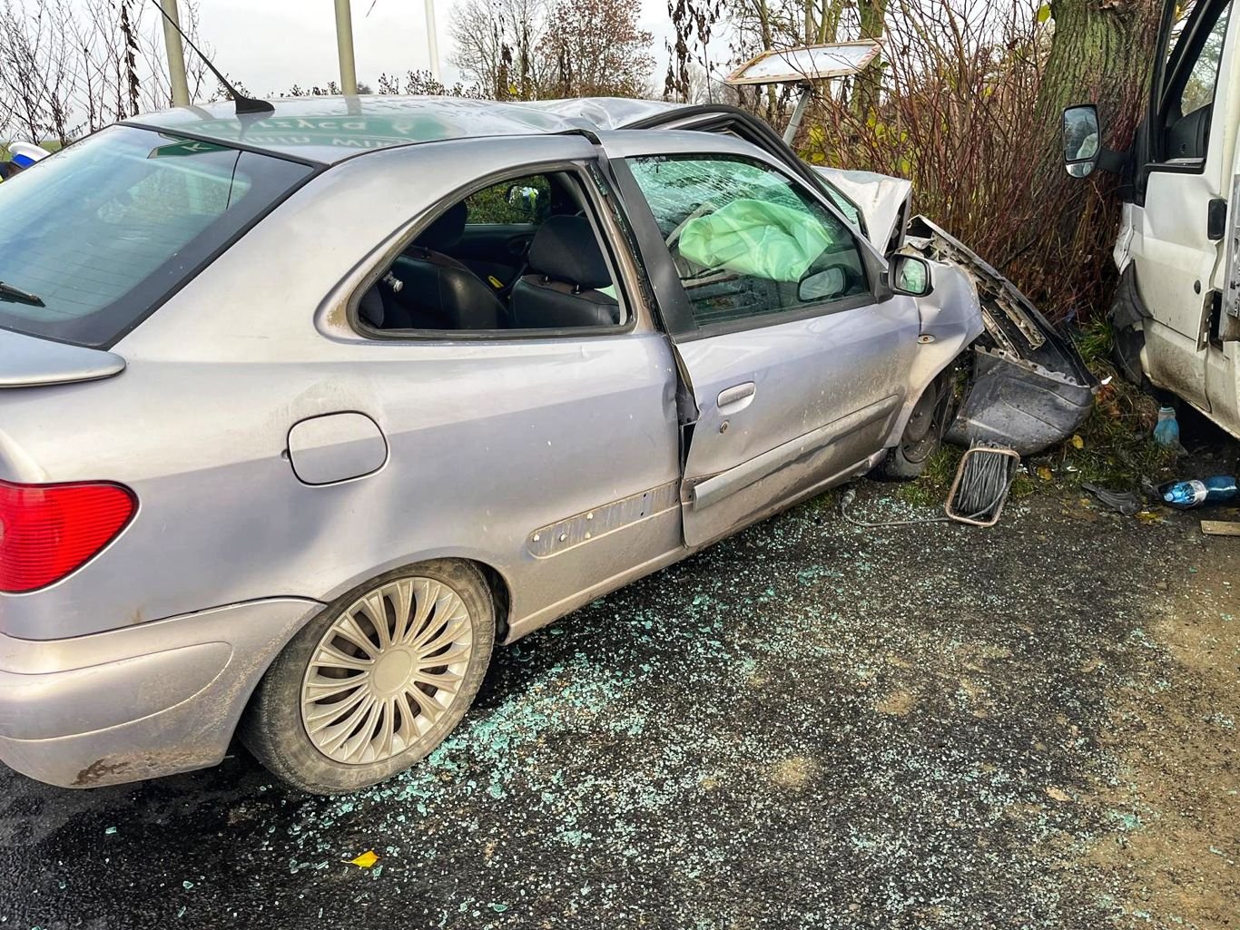 Kierowca samochodu dostawczego marki Ford (z powiatu ostrowskiego) wymusił pierwszeństwo na Citroenie, którym podróżowało dwóch obywateli Ukrainy. Oba pojazdy po zderzeniu zatrzymały się na drzewie.