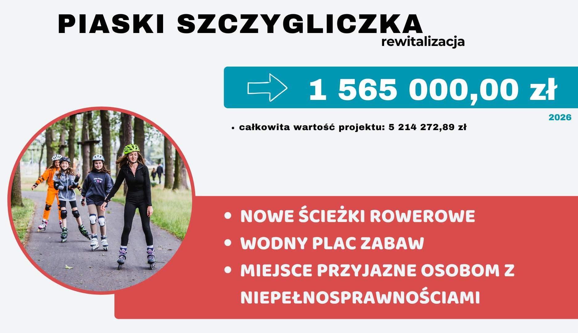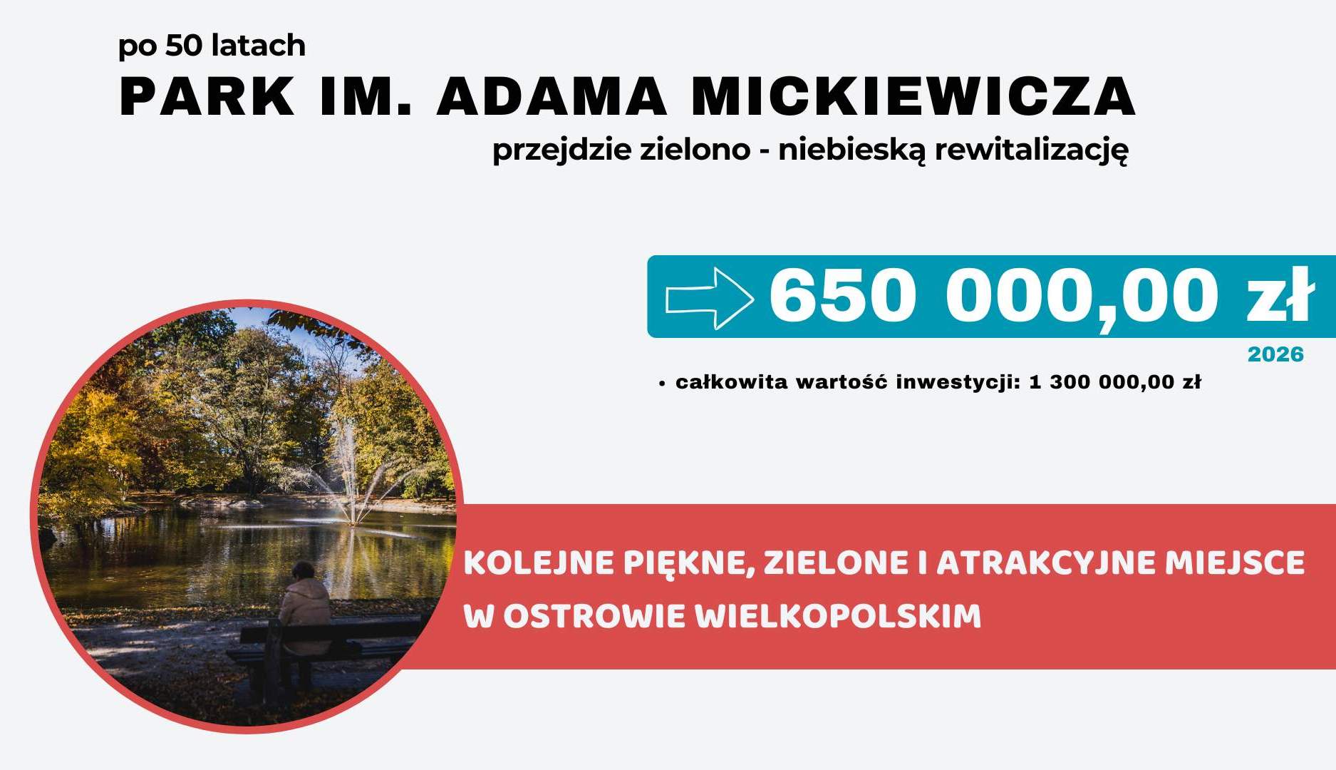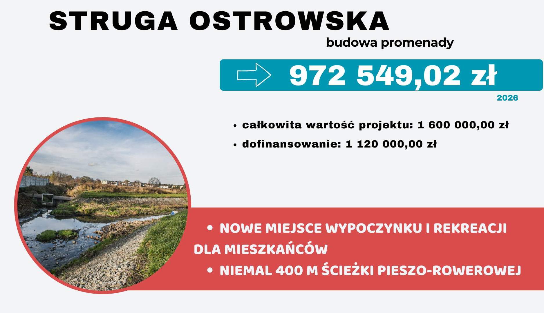 Miasto stawia również na rozwój terenów rekreacyjnych. Wśród zaplanowanych inwestycji znalazły się rewitalizacja Rynku, Parku im. Adama Mickiewicza oraz Piasków–Szczygliczki, a także budowa promenady nad Strugą Ostrowską. Nowe i odnowione przestrzenie mają sprzyjać wypoczynkowi, aktywności fizycznej i integracji mieszkańców.