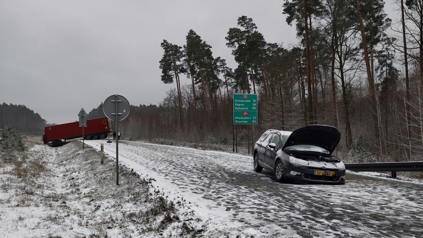 Tuż przed rondem Strugi doszło do zderzenia Citroena z samochodem ciężarowym pochodzącym z powiatu kaliskiego. W wyniku kolizji ciężarówka zjechała na lewy pas ruchu i zatrzymała się w poprzek drogi. Chwilę później w jej bok uderzył samochód dostawczy należący do jednej z dużych firm meblarskich z powiatu kępińskiego.