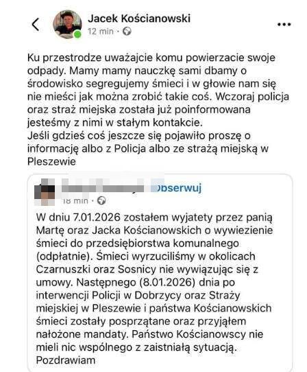 W dniu 7 stycznia 2026 roku, po interwencji Policji w Dobrzycy oraz Straży Miejskiej w Pleszewie, odpady zostały uprzątnięte. Osoby biorące udział w interwencji przyjęły nałożone mandaty. Podkreślono również, że właściciele korespondencji odnalezionej wśród śmieci nie mieli nic wspólnego z nielegalnym pozbyciem się odpadów.