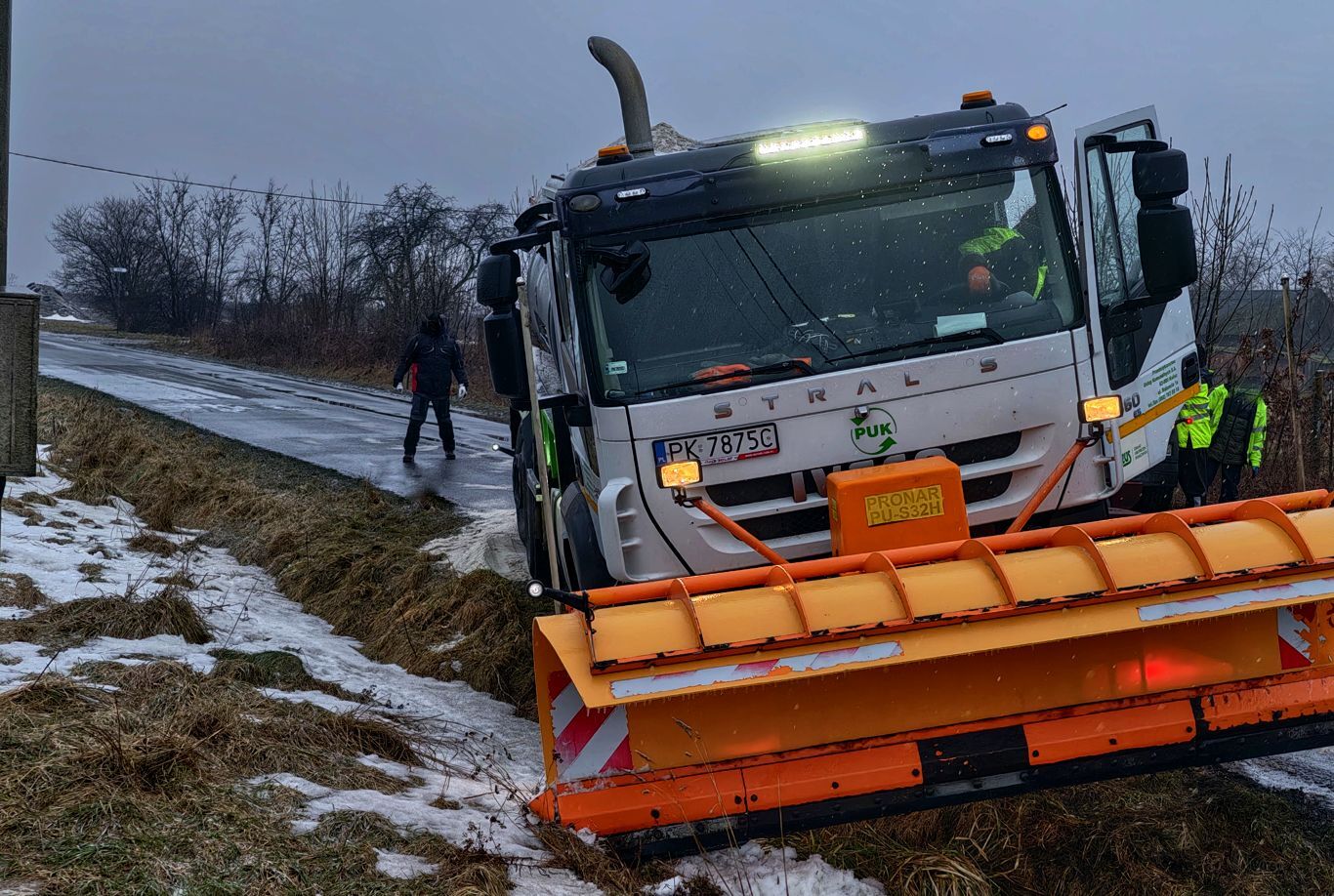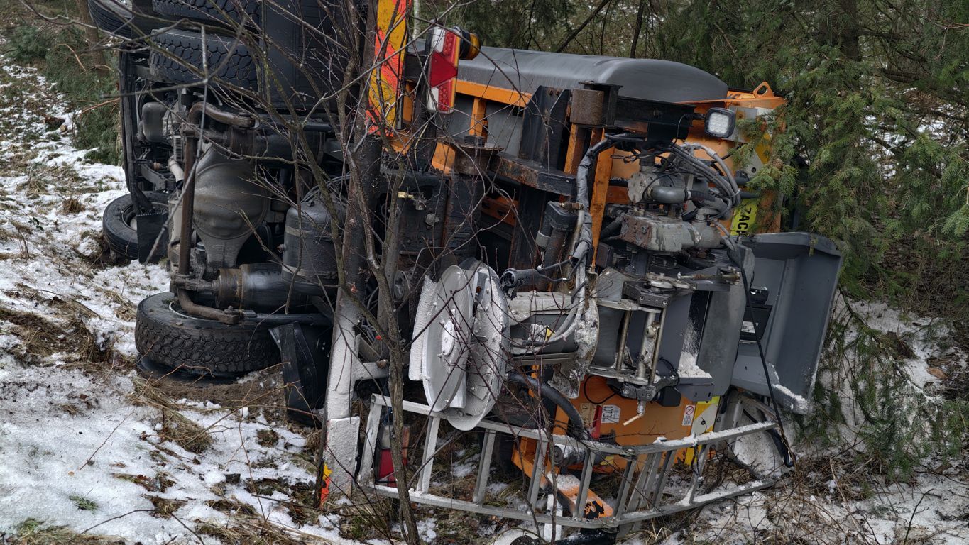 Problemy dotknęły nawet sprzęt przeznaczony do walki z zimą. Dwie solarki wypadły z drogi, z czego jedna przewróciła się na bok. Sytuacja ta najlepiej obrazuje, jak zdradliwe były warunki – skoro kłopoty miały pojazdy przystosowane do zimowego utrzymania dróg, zwykli kierowcy znaleźli się w jeszcze trudniejszym położeniu.