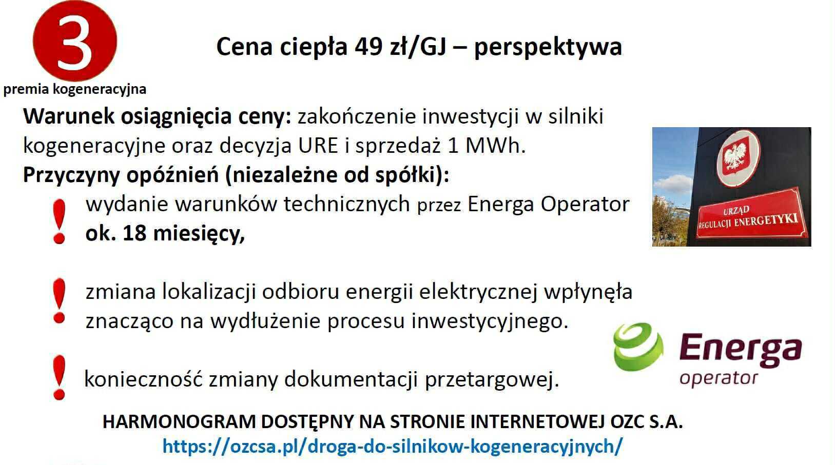 Po zakończeniu wszystkich etapów inwestycji kogeneracyjnych możliwe będzie osiągnięcie ceny ciepła na poziomie nawet ok. 49 zł/GJ. Warunkiem jest m.in. uzyskanie decyzji URE oraz możliwość sprzedaży energii elektrycznej w ramach kogeneracji.
