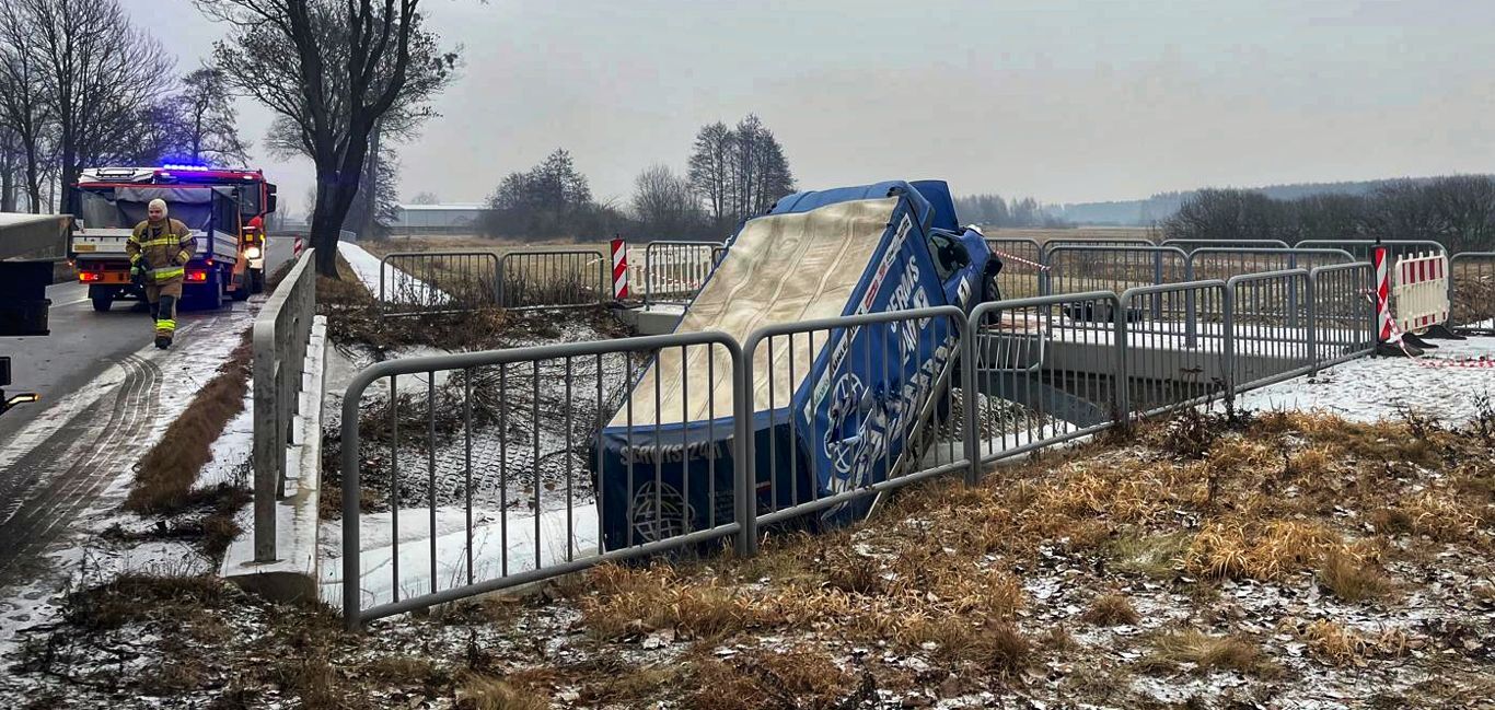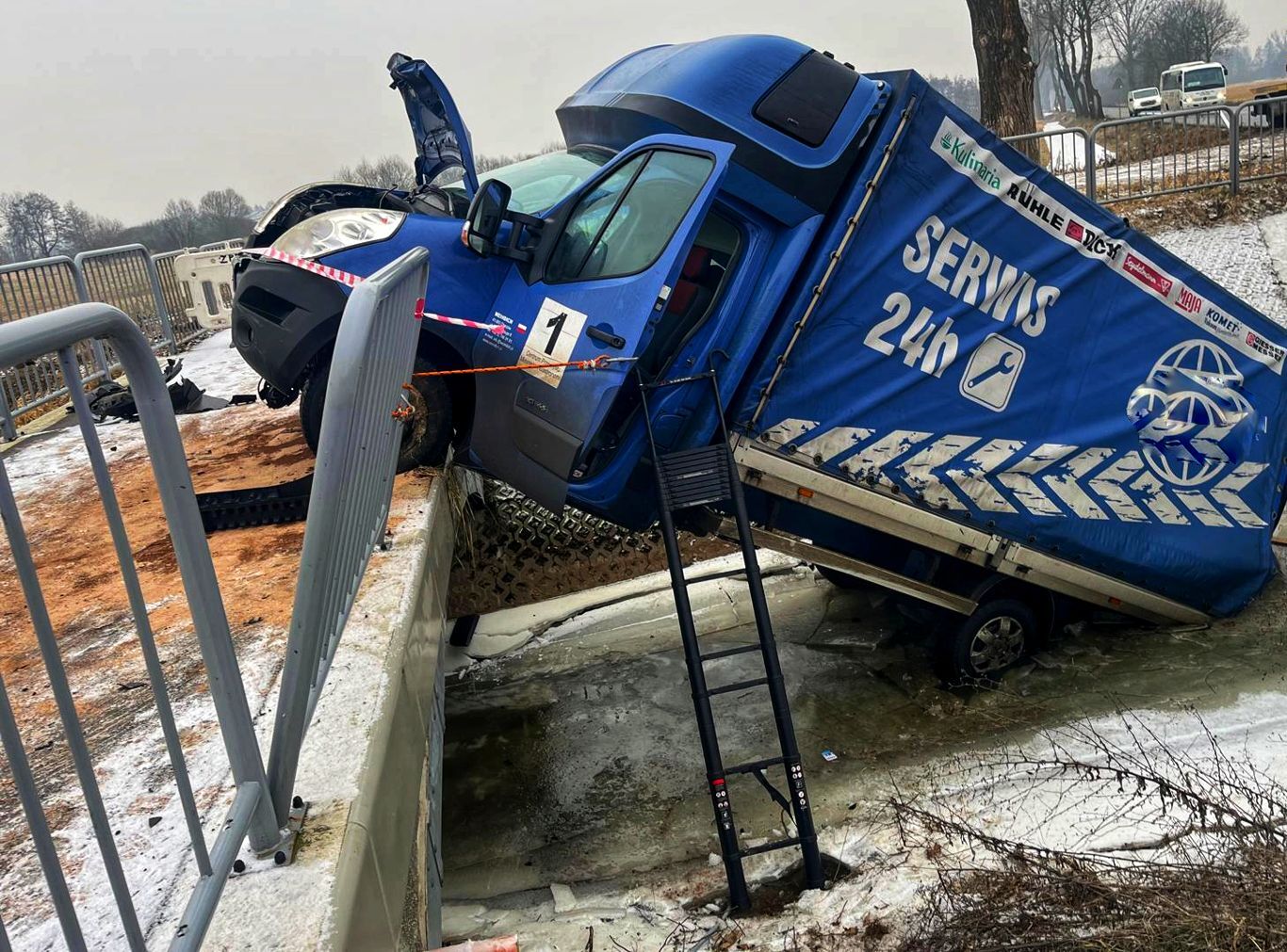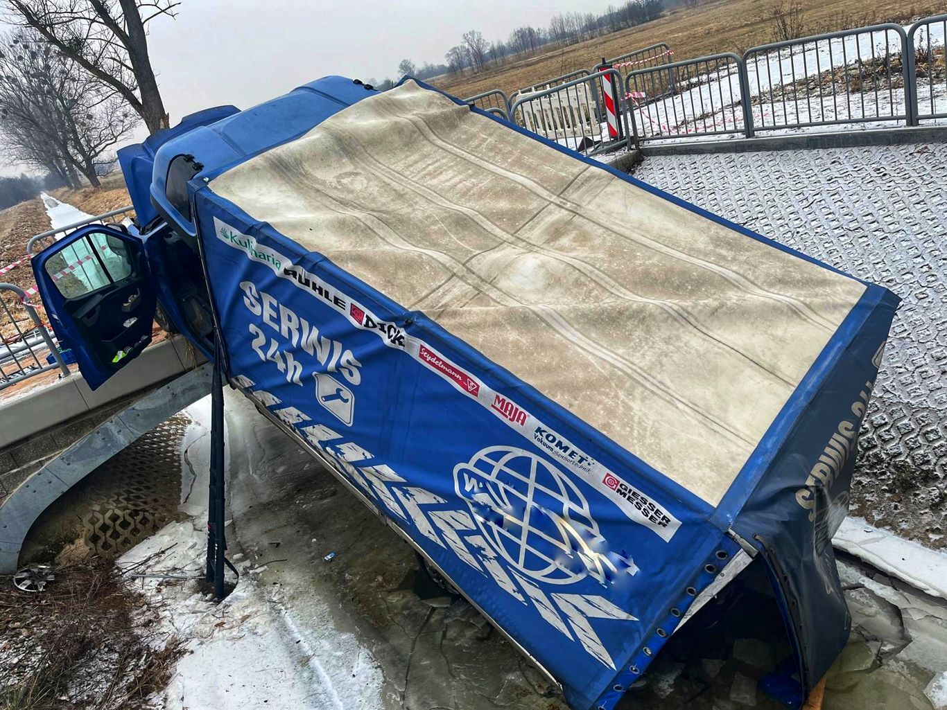 Kierowca z jednej z firm ze Śląska relacjonował, że z przeciwka ciężarówka zaczęła zjeżdżać na jego pas. Mężczyzna wykonał manewr obronny i wypadł z drogi, a następnie tyłem zsunął się do rzeki.