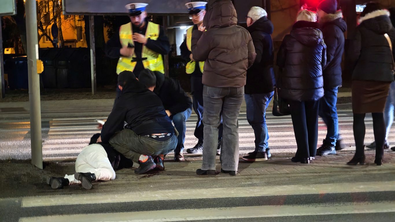 Według relacji świadków, jako pierwsi poszkodowanej pomogli kierowcy oraz piesi, którzy zauważyli kobietę leżącą pomiędzy przejściami dla pieszych. Poszkodowana, 50-letnia kobieta, była przytomna i w logicznym kontakcie, jednak odniosła obrażenia twarzy. Widoczne było uszkodzenie nosa oraz krwawienie.