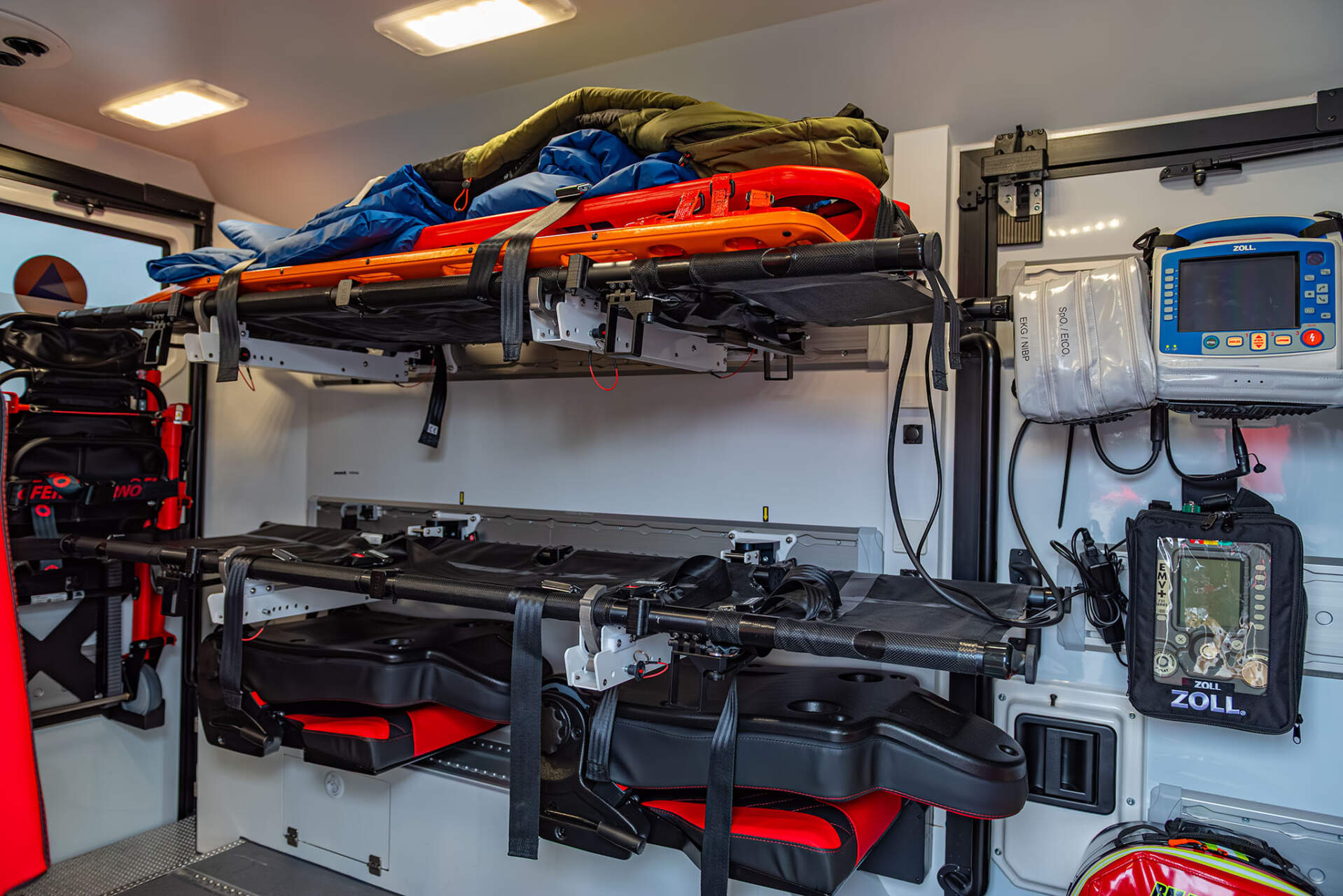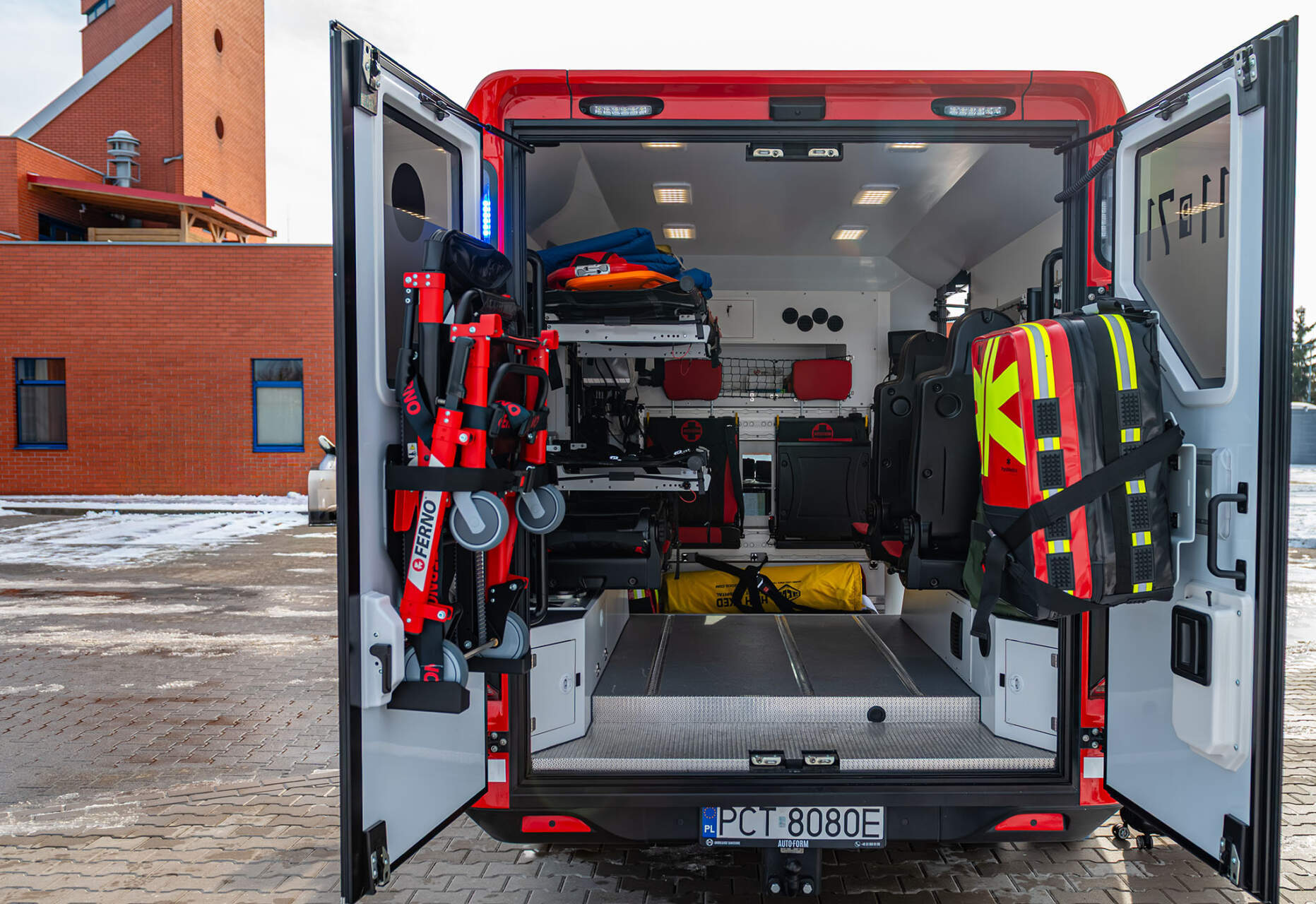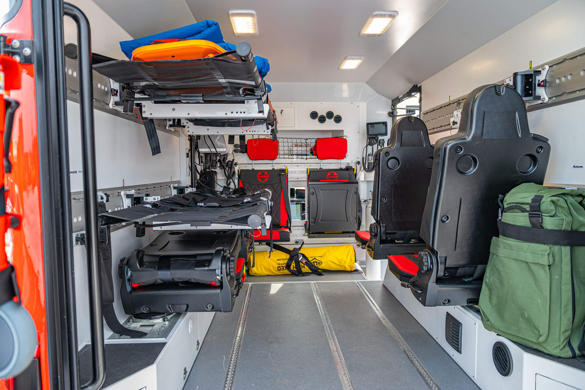 Wnętrze zabudowy przystosowane jest do transportu sześciu osób w pozycji siedzącej lub czterech w pozycji leżącej po złożeniu siedzeń bocznych.