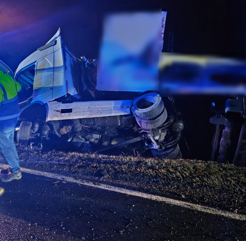 Do groźnie wyglądającego zdarzenia drogowego doszło w poniedziałek po godzinie 3:00 w miejscowości Piątek Mały, w gminie Stawiszyn. Na drodze krajowej nr 25 samochód ciężarowy z nieustalonych jeszcze przyczyn zjechał z jezdni i wpadł do przydrożnego rowu.