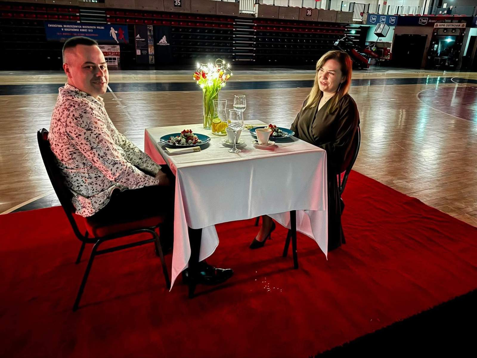 Wyobraźcie sobie kolację tylko we dwoje… na samym środku ogromnego parkietu 3mk Areny Ostrów. Miejsca, które na co dzień tętni sportowymi emocjami i koncertową energią, tego wieczoru zamieniło się w romantyczną przestrzeń rodem z najpiękniejszych historii miłosnych.