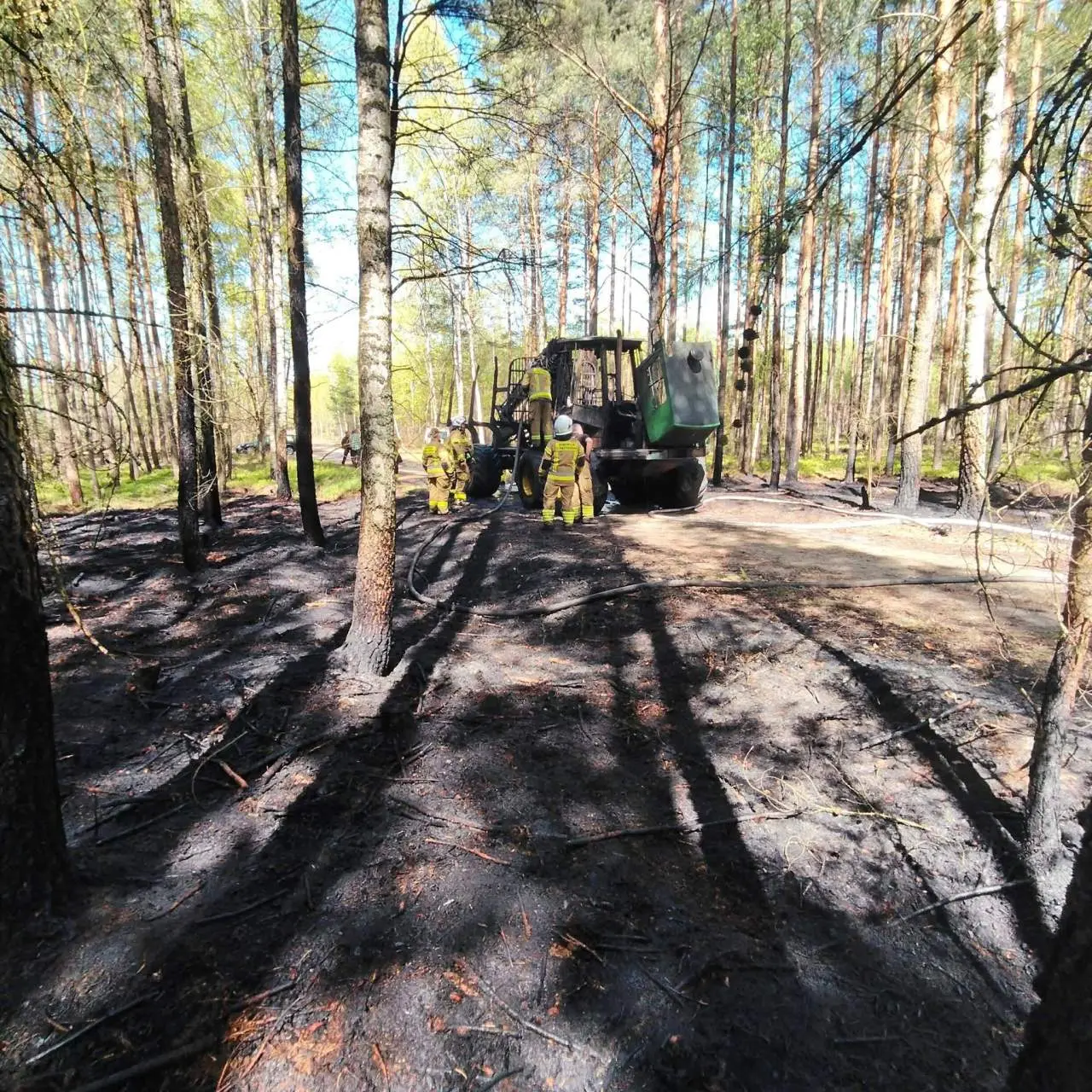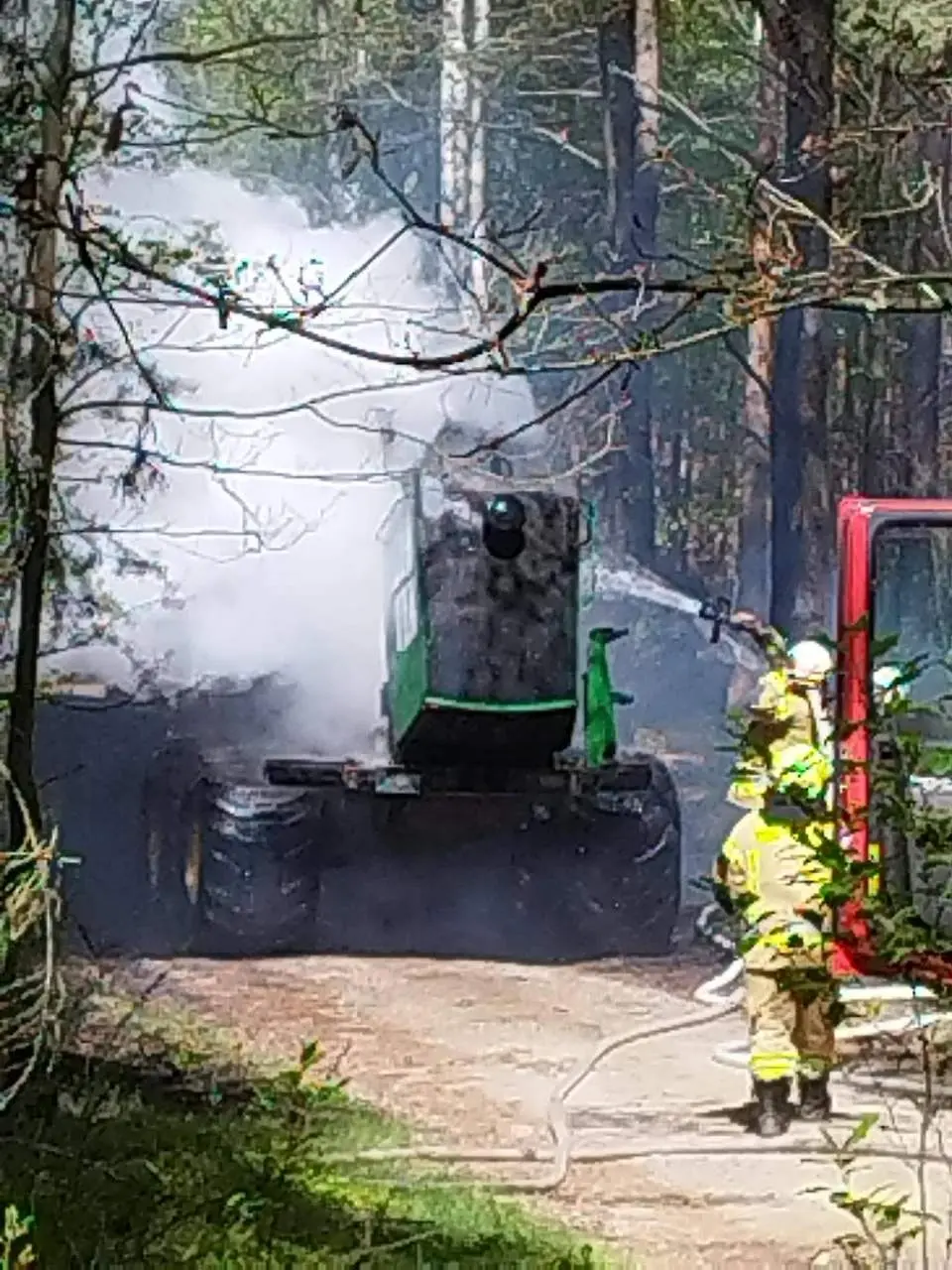 Na miejscu pracowała ciężka maszyna leśna typu forwarder — pojazd o dużych, szerokich kołach przystosowanych do poruszania się w trudnym, leśnym terenie. Maszyna wyposażona była w hydrauliczną żurawikową ładowarkę do przenoszenia drewna oraz przestrzeń ładunkową z tyłu. W wyniku pożaru kabina operatora została poważnie uszkodzona — widoczne były nadpalone elementy konstrukcyjne, stopione przewody oraz osmolone szyby. Po ugaszeniu ognia z wnętrza maszyny nadal wydobywał się dym, a strażacy dogaszali zarzewia ognia, polewając elementy pojazdu wodą.