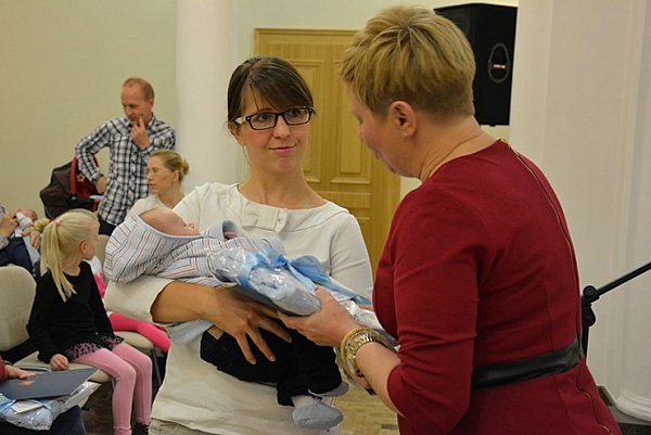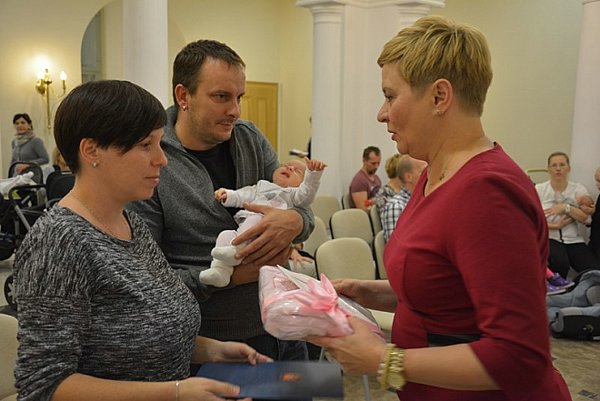 Ostrowskie maluszki pojawiły się dziś na rękach swoich rodziców i babć, by w Sali Kolumnowej Ratusza otrzymać pozytywne decyzje w sprawie przyznania jednorazowego świadczenia z tytułu urodzenia dziecka.