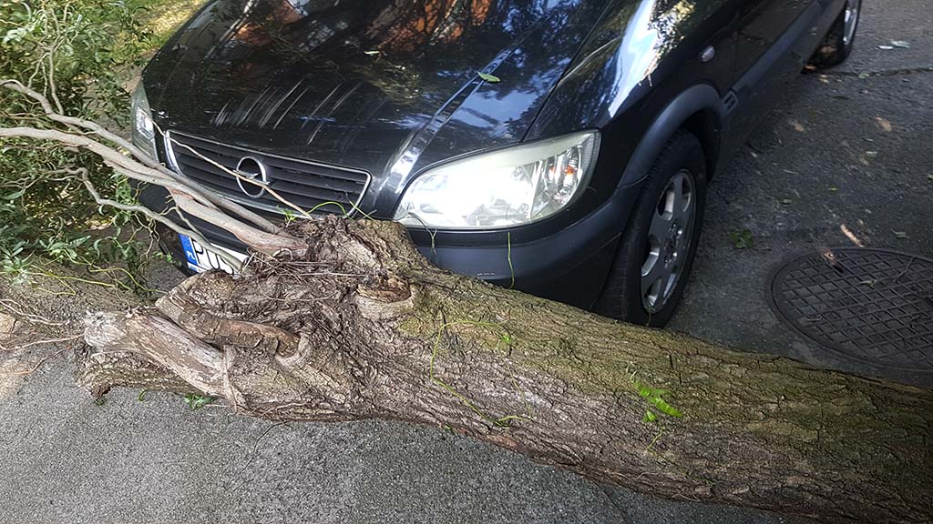 Opel Zafira był zaparkowany pomiędzy blokiem, a prywatną posesją. Jeden z podmuchów przewrócił dwa sąsiadujące ze sobą drzewa. Te złamały się u podstawy i przewróciły na Opla. Nikomu nic się nie stało.