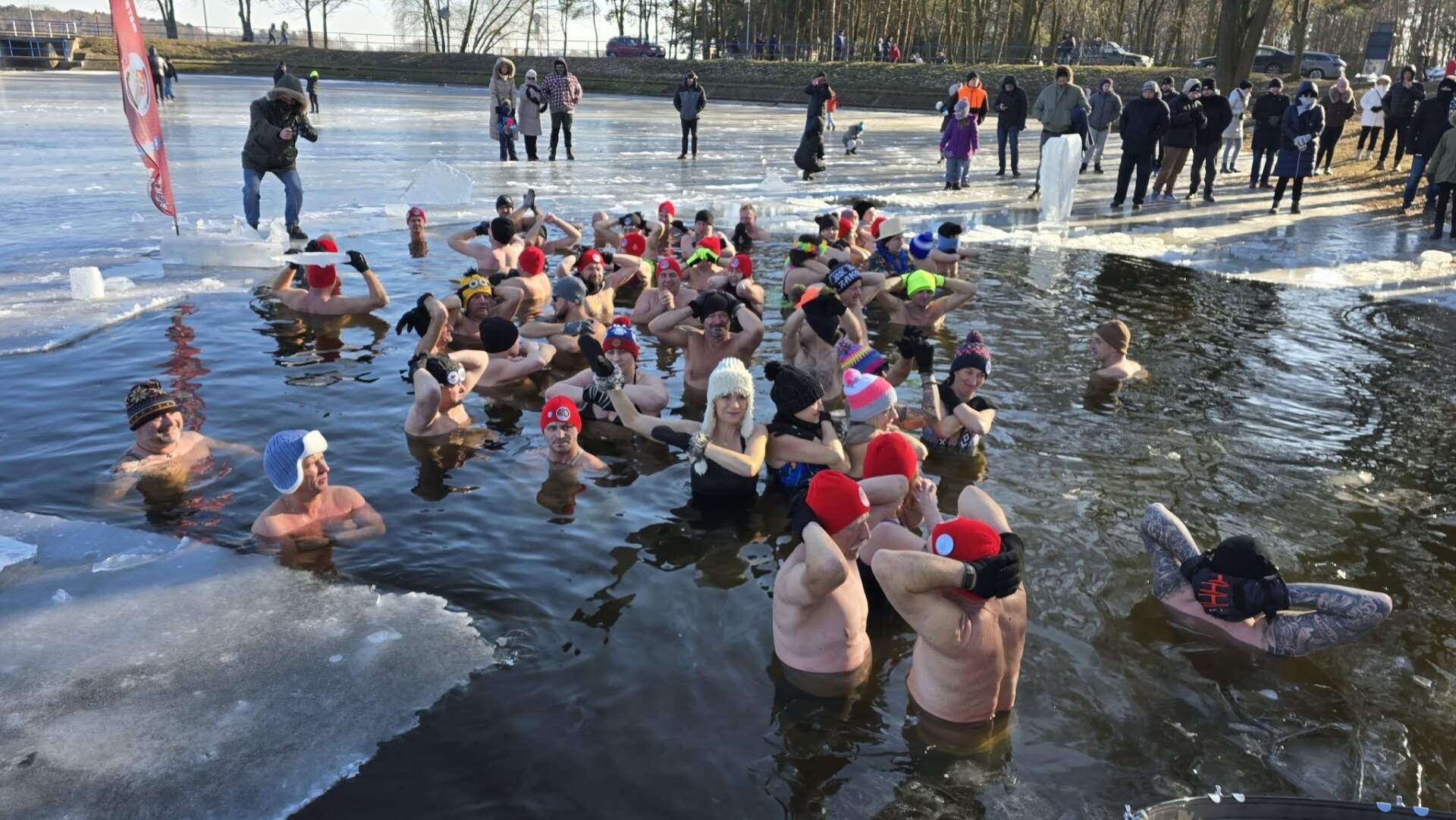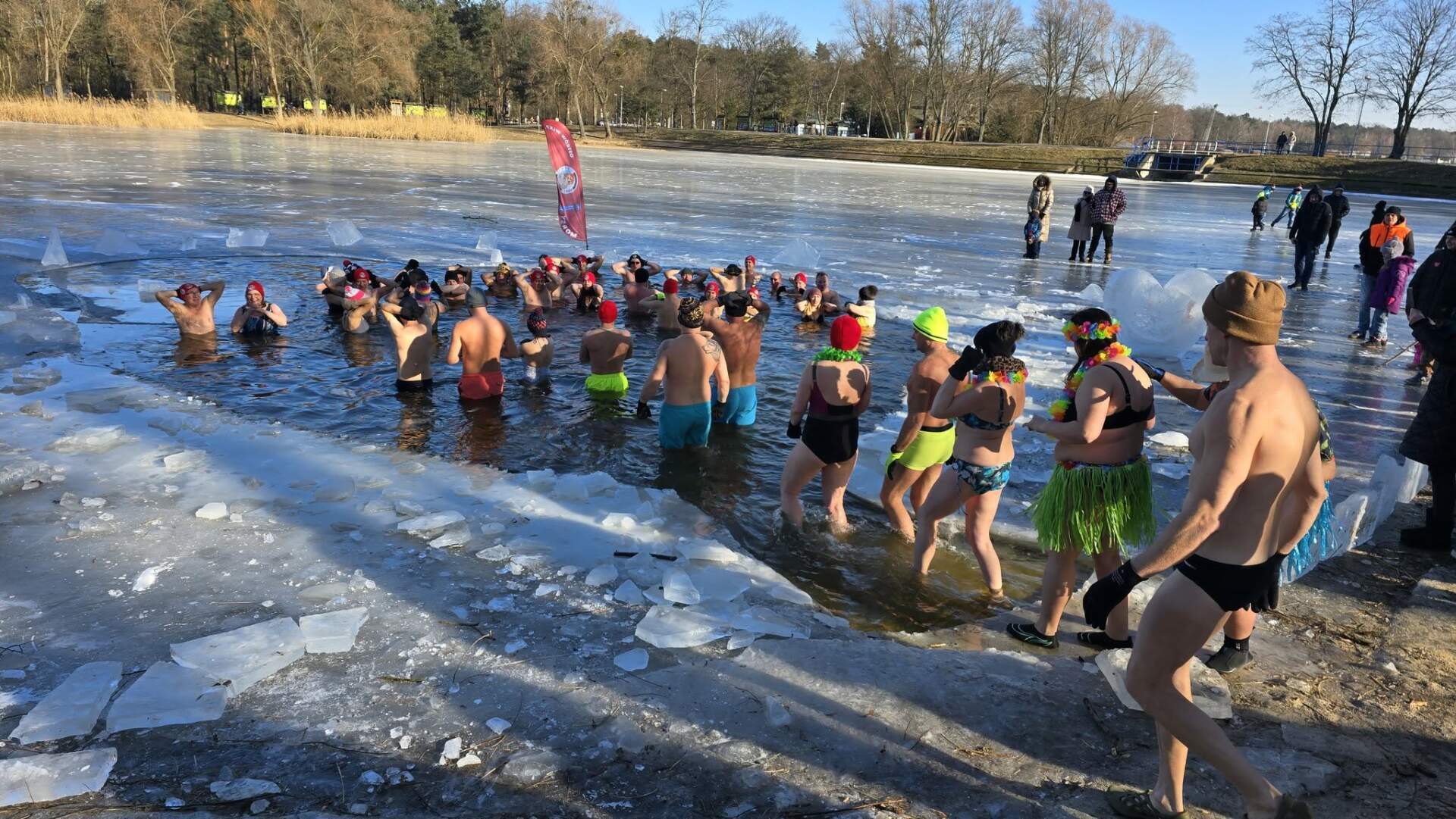Na ostrowskich Piaskach zima pokazała swoje prawdziwe oblicze – lód w wielu miejscach osiąga imponujące 20 centymetrów grubości. To idealne warunki nie tylko dla miłośników mroźnych kąpieli, ale również dla fanów wędkarstwa podlodowego. Nic dziwnego, że właśnie tutaj organizowane są zawody wędkarskie, a tuż obok – kąpiele w przeręblu, które przyciągają śmiałków od wczesnych godzin porannych aż po sam wieczór. Największy ruch? Tradycyjnie w samo południe, gdy atmosfera robi się naprawdę gorąca – mimo zimna!