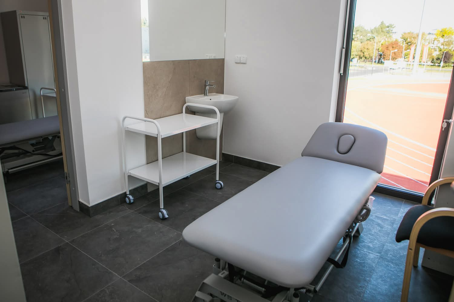 Integralną częścią kompleksu jest dwukondygnacyjny budynek w kształcie litery L, w którym znalazły się m.in. siłownie, sale rehabilitacyjne, jadalnia, sala konferencyjna, szatnie, biuro zawodów oraz 100-metrowa bieżnia kryta. Kibice zyskali trybunę na 500 miejsc z wydzielonym sektorem gości i pomieszczeniem komentatorskim.
