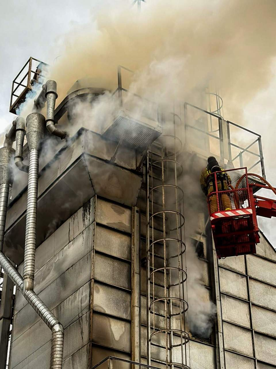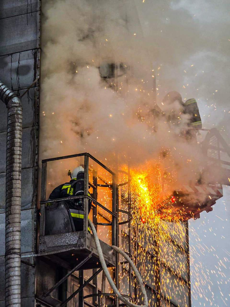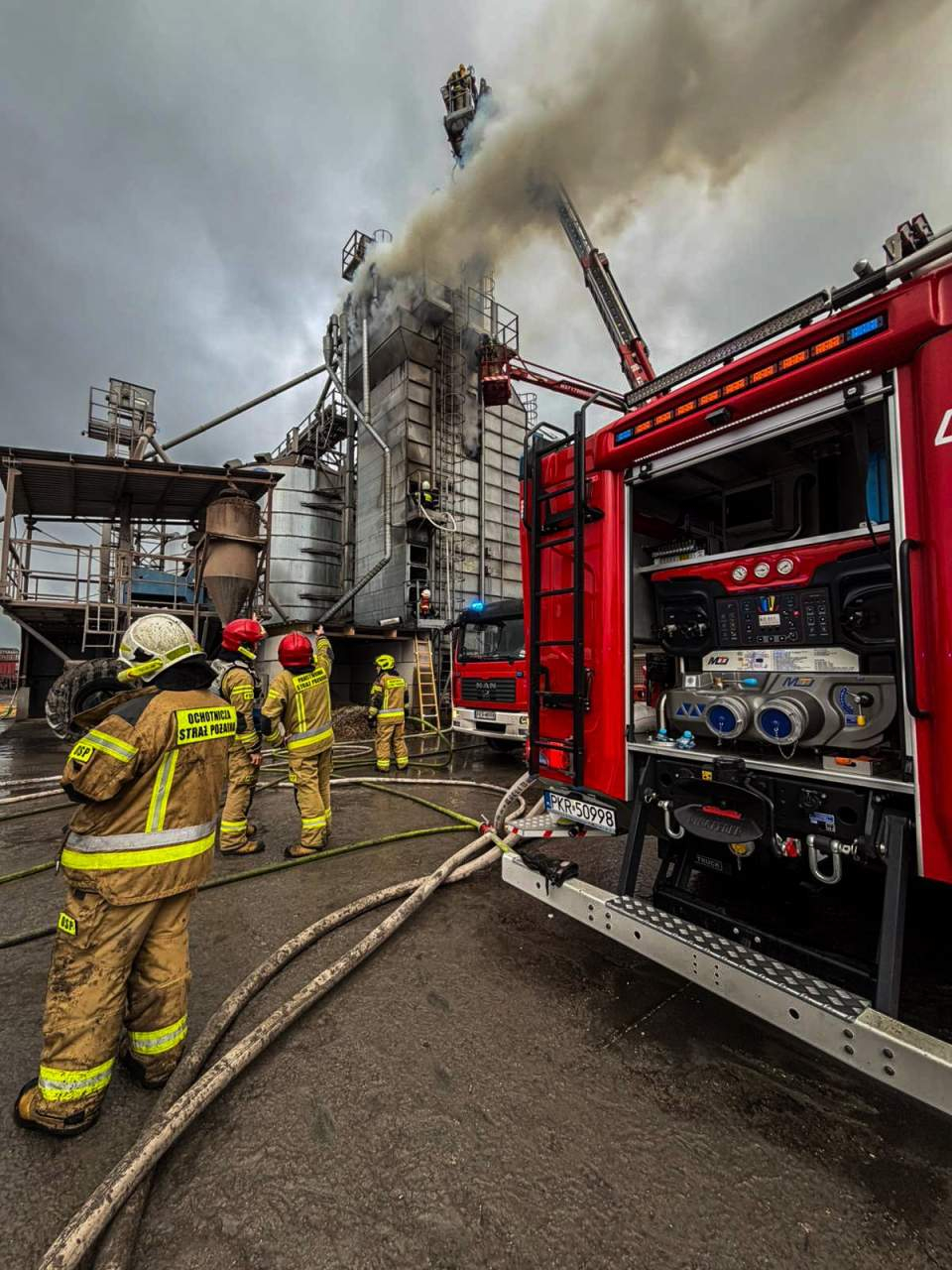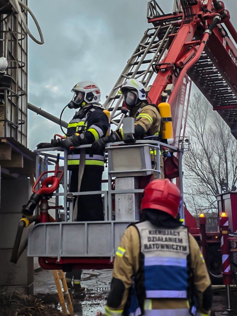 Strażacy, którzy jako pierwsi dotarli na teren posesji, zastali rozwinięty pożar – płomienie były już widoczne na zewnątrz suszarni. Akcja gaśnicza wymagała dużej ostrożności ze względu na wysokość obiektu oraz znaczną ilość nagromadzonych w nim materiałów palnych.